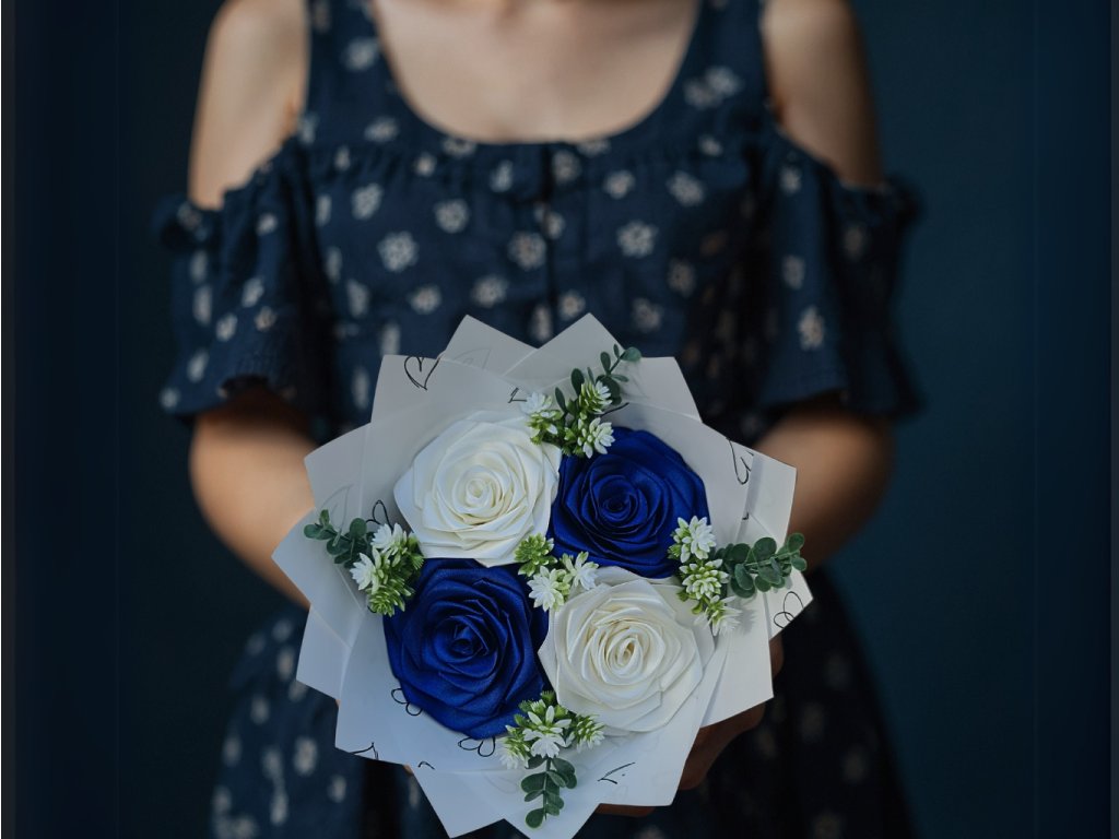 Obdarujte své blízké kyticí, která vydrží navždy krásná. Tato malá kytice ze stuh je složená ze čtyř květů v elegantní kombinaci tmavě modré a krémové barvy. Díky ruční výrobě je každý kus originál a stane se stylovou dekorací i osobním dárkem, který nikdy neztratí svou krásu. Ideální volba pro drobnou pozornost, poděkování či zútulnění interiéru.