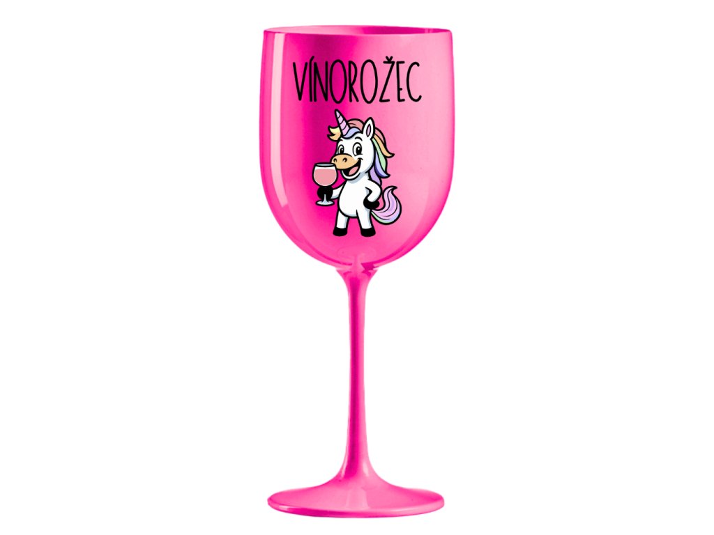 Růžová plastová sklenička na víno s potiskem „Vínorožec“. Originální kousek, který rozveselí každou party i piknik.