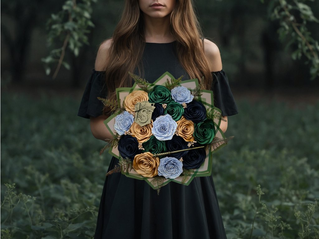 Ručně vyrobená z 18 růží ze saténových stuh v tónech smaragdové, černé a zlaté, doplněná o papírové květy s efektem spáleného pergamenu. Zlatá hůlka a znak koleje dodávají celé kompozici výjimečný vzhled a atmosféru kouzelnického světa.