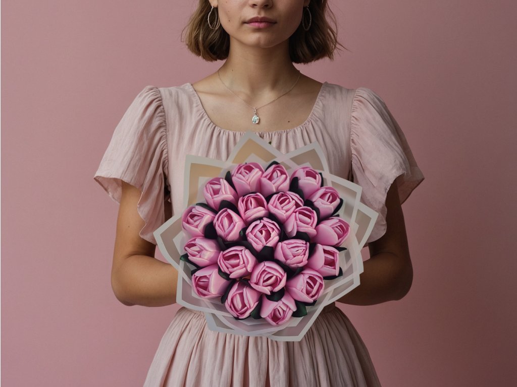 Kytice 21 růžových tulipánů ze stuh. Originální dárek, který nikdy nezvadne a vykouzlí úsměv při každé příležitosti.