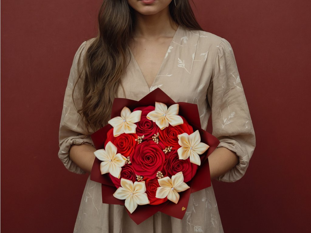 Kytice, která spojuje eleganci a vášeň. Ručně vyrobená ze saténových stuh, ideální jako dárek z lásky nebo překvapení, které nikdy nezvadne.