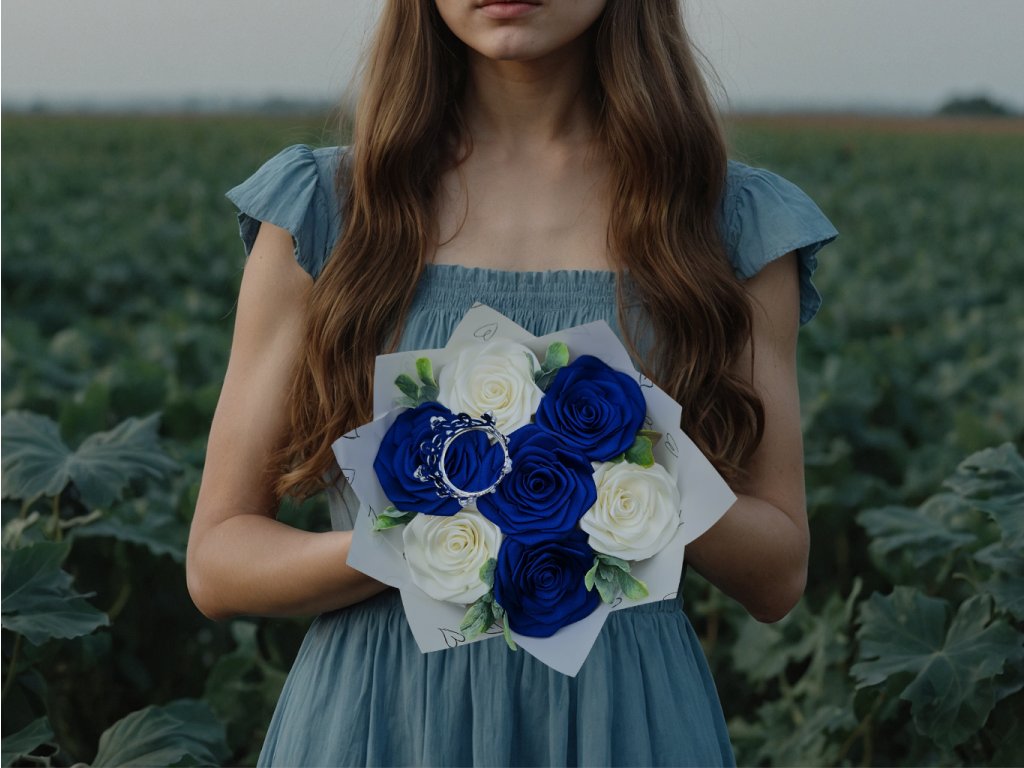 Tmavě modrá jako noční obloha, krémová jako jemné světlo svíček – a uprostřed nich korunka, která celé kytici dodá jiskru výjimečnosti. Tato střední kytice ze stuh je tvořená ze sedmi ručně tvarovaných růží, které nikdy nezvadnou a zůstávají navždy krásné.
