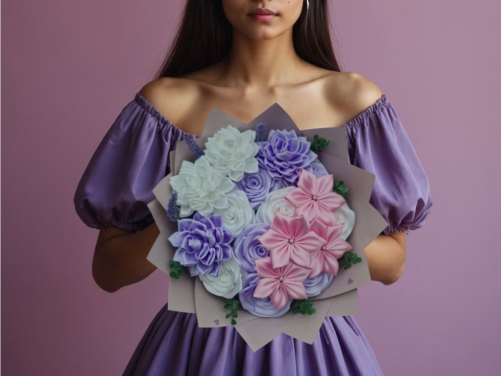 Výjimečná kytice plná barev a druhů květů. Tato střední kytice ze stuh je tvořena 17 květy – jiřinami, růžemi a plumériemi v jemné kombinaci bílé, fialové a růžové barvy. Každý květ je pečlivě ručně vyrobený, díky čemuž je kytice jedinečná a originální. Hodí se jako slavnostní dárek, dekorace k oslavám i stylový doplněk do interiéru. Na rozdíl od živých květin nikdy nezvadne a zůstane krásná po dlouhá léta.