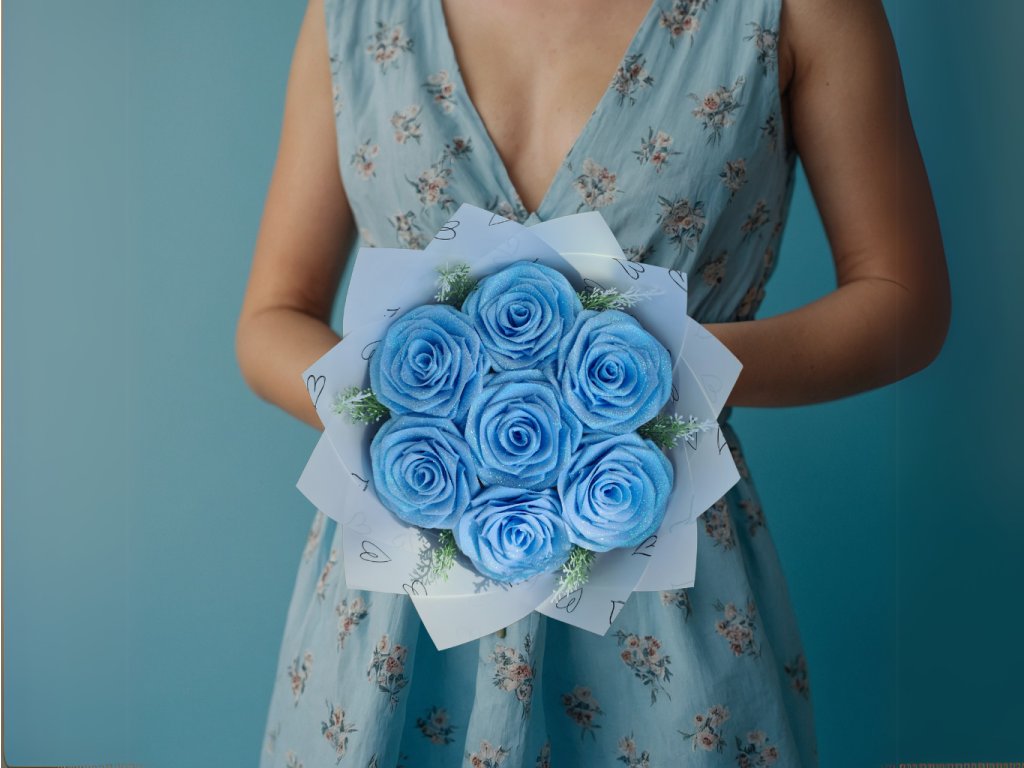 Výjimečná kytice, která září elegancí i originalitou. Tato střední kytice ze stuh je tvořena sedmi růžemi ve světle modré barvě zdobené jemnými třpytkami. Díky ruční výrobě z kvalitních stuh je každý kus jedinečný a stane se originálním dárkem k narozeninám, výročí nebo dekorací do interiéru. Na rozdíl od živých květin nikdy nezvadne a zůstane krásná po dlouhá léta.